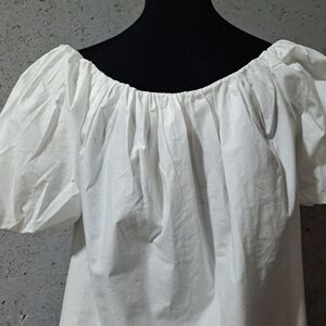 This elegant white blouse showcases bishop sleeves and a relaxed, ruffled design. Lightweight fabric, it offers a graceful silhouette with gathered cuffs & shoulders for added charm. Perfect for infusing a touch of romance into your ensemble.