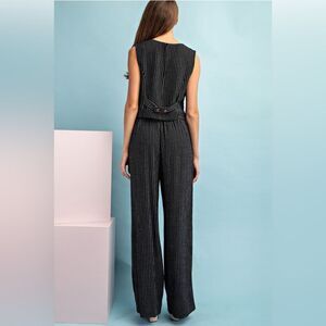 Pinstripe button down, sleeveless vest, featuring v-neckline and back waistline cinching. Pants are full length with elastic drawstring waist, two side hip pockets, straight leg style.