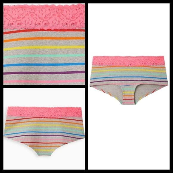 0X 12W Large Torrid Rainbow Boyshort Panty Pride Pink Lace Wide Band Summer Plus size cotton underwear. Flaw in rainbow graphic print, see photos. NWT Torrid. Measurement photos approximate reference only. 6×9×1 wt 3oz
