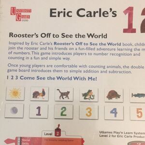 Based on the Eric Carle’s ROOSTER OFF TO SEE THE WORLD book. Children join the rooster and his friends in a fun filled adventure of learning the meaning of numbers . Introduce players to number recognition and counting in a fun and simple way