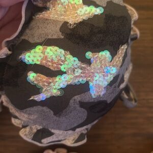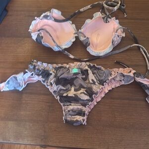 Stylish camo bikini with ruffle details. Features a unique pattern with hints of pink and green. Fully lined and triangle top has very slight padding. Got this on a trip to Greece. EUC