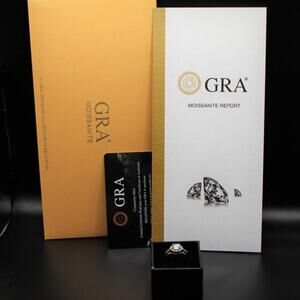 includes a certificate of authenticity for the Moissanite stone, a warranty card, and a gift box,