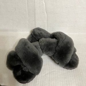 EMU Australia "Maryberry Frost" Sheepskin Crossover Slides | Charcoal grey Water-Resistant Crisscross Slippers in new condition, no box, Fit: If you're between sizes, we recommend sizing up