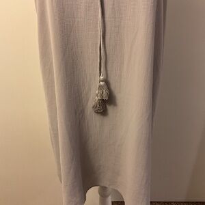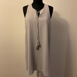 Light grey sleeveless tunic dress with a relaxed fit, featuring a tie detail at the neckline and a flowy design