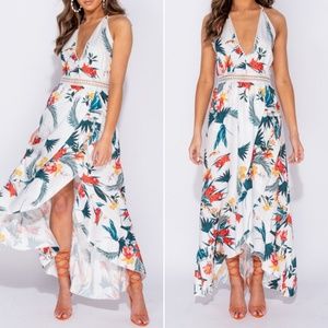 *1 LEFT *Embroidered Faux Wrap Floral Halter Maxi