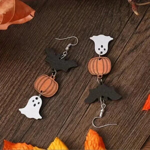 1 LEFT! Halloween Bat, Pumpkin, & Ghost Wood Dangle Earrings