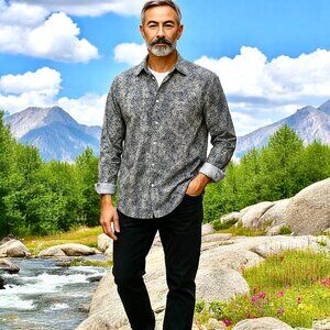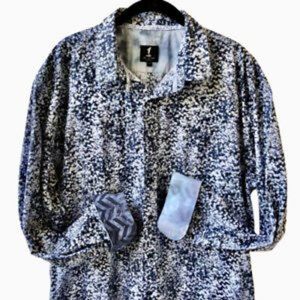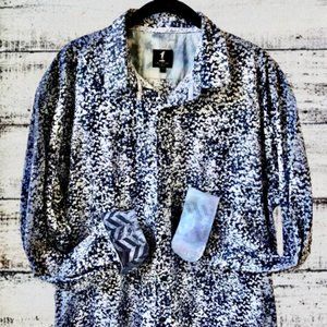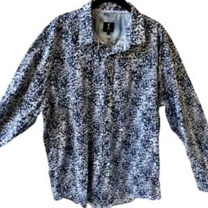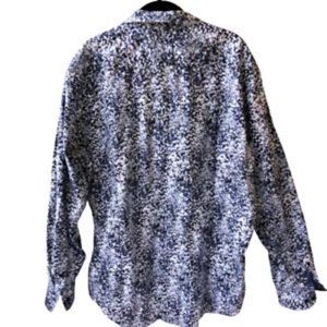 1 LIKE NO OTHER London 100% crisp cotton button up long sleeve shirt. Colors are black and white in a star/leaf pattern. The cuffs are non-matching. Rounded hem. 1 logo at bottom placket.