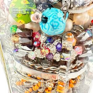 Mixed jar of mostly silver tone jewelry. I tried to make sure all pieces are in wearable or sellable condition but I’m human and something may have been missed.