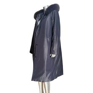 This sophisticated winter coat combines luxury and functionality with its premium hood, removable fox fur, and sleek dark gray fabric. The full-length silhouette offers maximum coverage while maintaining an elegant aesthetic. Features a concealed button front closure and quilted lining for warmth.