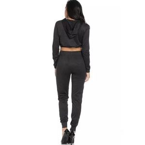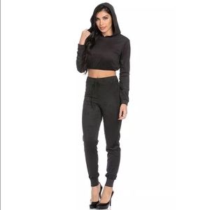BRAND NEW! PERFECT FOR FALL! SEXY 2 PIECE SUEDE CROP HOODIE AND JOGGER SET IN BLACK SIZE SMALL, MEDIUM, AND LARGE. I ALSO HAVE THIS AVAILABLE IN PINK SO BE SURE TO CHECK MY OTHER LISTINGS!!