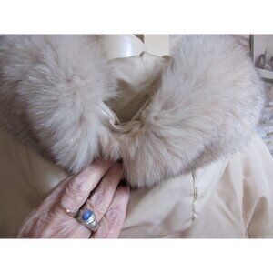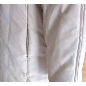 This elegant puffer coat combines luxurious fox fur trim with reliable down/feather insulation, ensuring warmth and sophistication in colder weather. The coat has a zippered pocket on each side. In a light beige color in size XL. The outside of the coat is 58 percent polyester and 42 percent nylon. The filing inside the quilted coat is 60 percent down and 40 percent feathers. The fur around the hood is fox fur. In nice shape, please see the photos.