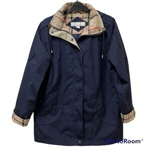 Navy with plaid accents. Front zip with snaps and Velcro. Rain hood Velcros into collar when not in use. Roll back cuffs. Large front pockets. Measures 21” armpit to armpit and 30” in length.