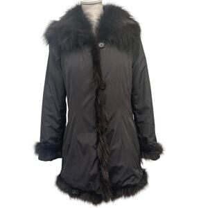 Features: Luxurious dyed genuine fox fur trim at hood, placket, cuffs, and hem; sleek weatherproof shell with insulating synthetic fill; side pockets; three-button closure; drawstring-adjustable hood; lined interior for warmth and comfort; mid-thigh length silhouette; style 426708.