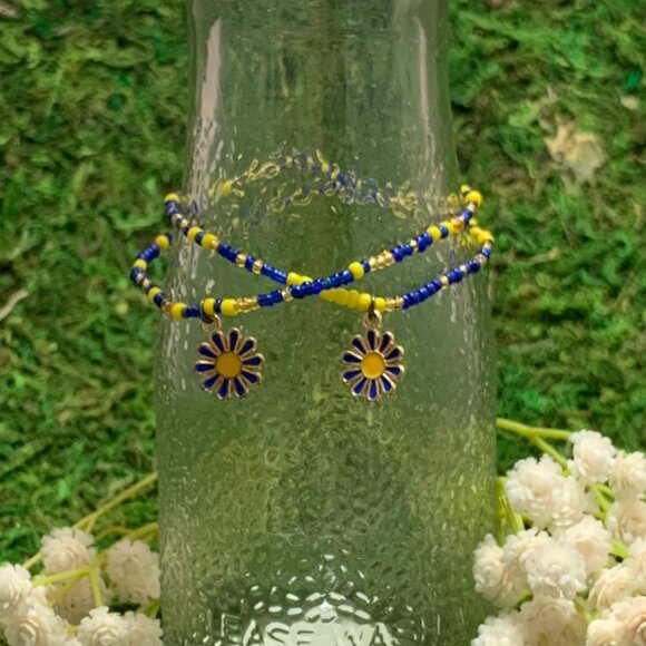 This seed bead bracelet is made up of three colors, gold, yellow, and navy blue with a gold-plated blue flower charm. All seed bead bracelets are made with an elastic stretch cord.