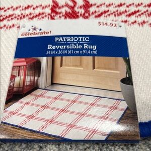 1 Reversible rug featuring a patriotic design. Red and blue accents on a white background.