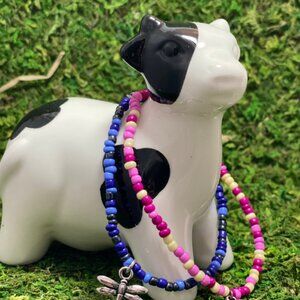 This bracelet is made up of three colors, peach, pinky and light pink with a silver heart charm.