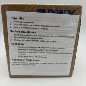 This is one (1) new, sealed roll of Brady ToughStripe® Floor Marking Tape, model B-514. The tape is Black and Yellow, measuring 3 inches wide by 100 feet long (76.2mm x 30.5M). It is a durable vinyl tape that is packaged to resist wear and tear in industrial or commercial environments. The product is manufactured by Brady Worldwide. Lot# 23121691. Country of Origin: Mexico. SKU: 104347. Please ensure the application area is prepared by sweeping loose debris, wiping with a standard floor cleaning method, and allowing for sufficient dry time before application. Tape should only be installed at temperatures of 50°F (10°C) or higher.