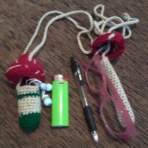 Your choice of one these crochet mushroom holders. Good for keeping anything close by on your bag, keychain, or wear as a necklace. Thank you for your interest in my handmade goodies 🤩