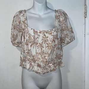 Cropped rayon blouse with neutral color scheme-beige with tan etched palm tree pattern, elastic collar, hem and cuffs with ruffle detail. Square neckline. Cotton lining. Excellent condition. Washable. Size Medium, measures 18” from armpit to armpit and 19” from top of shoulder to bottom hem.