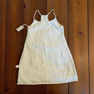 The 1. STATE Women's Dress in size M is a white eyelet mini dress perfect for a beach party or bridal event. Made from 100% cotton, the dress features an eyelet pattern, spaghetti straps, and a short length. The fun and flirty style is ideal for summer and spring occasions, with a lined interior for added comfort. Designed for regular sizing, this dress captures the theme of beach parties with its stylish and feminine accents. Perfect for a casual or party setting, this dress offers a chic and playful look for any occasion.