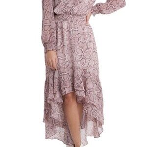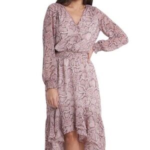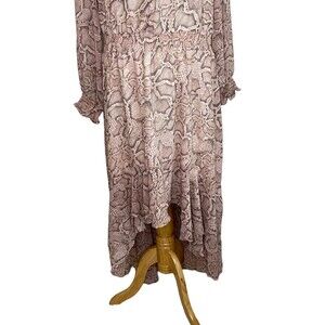 1. STATE Pink Ruffled Smocked Elastic-Waist Buttoned Snake Print Dress Cuffed Sleeve V Neck Maxi Cocktail Hi-Lo Dress. Size large. Missing one button please see photos. In good condition. Shell: 100 % polyester. Lining: 100 % polyester.