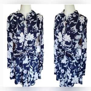 SAME DAY SHIPPING 1 STATE shirt dress is a stunning addition to any wardrobe. The navy and white floral pattern is perfect for casual occasions, and the long sleeves and V-neckline add a touch of elegance. The dress features a button closure and a tie front design that flatters any figure.