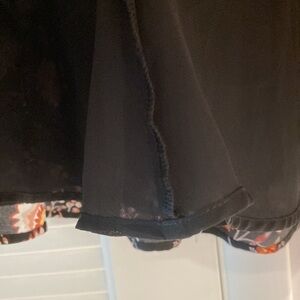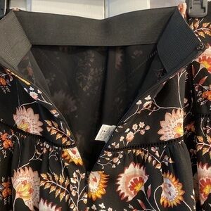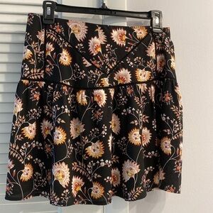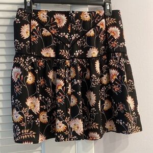 1 State floral skirt. Black background with tan gold and orange floral pattern. Fully lined. Elastic in the waist with back zip. Adorable skirt for fall. Machine wash and dry. Measurements are approximate: