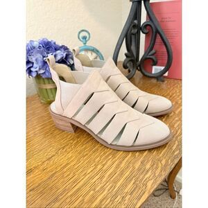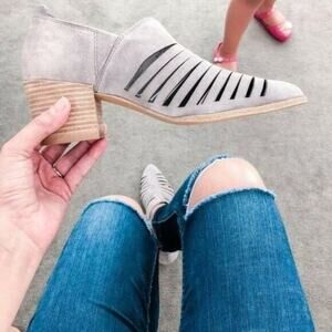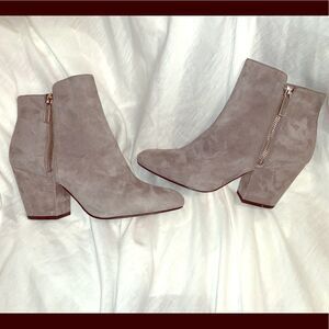 These “shootie” booties are the perfect neutral mushroom grey color that goes with everything. Perfect transitional shoe to go into spring & summer. Leather upper - looks and feels like suede. Style name is Arnet. Condition is nearly brand new/tiny marks- see photos. (White bg photo is the original stock photo.)