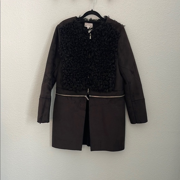 Experience the cozy embrace of the 1. State Black Teddy Jacket, designed with a plush, fuzzy texture for ultimate comfort. This mid-length jacket that can convert into a waist length jacket with the pull of a zipper! Like two jackets for the price of one. The beautiful textures combines, modern style with warmth, making it an essential addition to your outerwear collection.