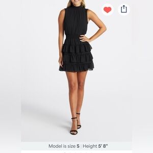 Chic black mini dress with tiered ruffles. Sleeveless design. Perfect for stylish outings.
