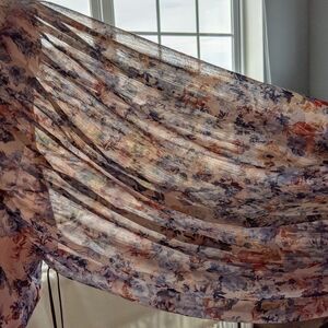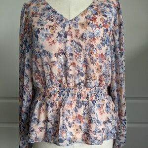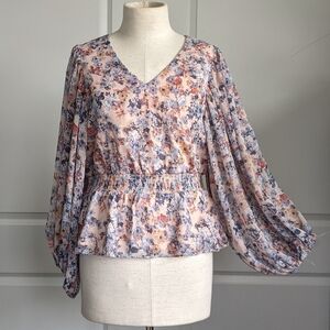 1. State Blouse V-Neck Long Sleeves Sheer Floral Peplum Waist Pink Blues M NWT