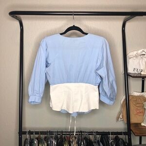 Size small. Blue and white stripes with puffed raglan 3/4 sleeves. Built in white corset with adjustable tie. Side zip. Rounded hem. Stretchy and lightweight cotton and spandex blend.