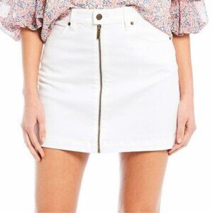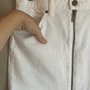 **An edgier take on the classic denim skirt. This skirt is constructed from ultra white denim and features a button closure, front zipper, 5 pocket design and belt loops. Measurements laying flat