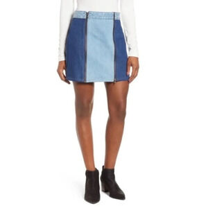 1. State Double Zipper Colorblock Denim Mini Skirt - Size 4. Great pre-owned condition. Sold at Nordstrom. Unlined, 2 tone denim, Front zip closure, 100% cotton,