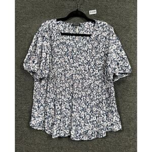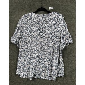 1. State Floral Blouse Womens Size 2X Blue White Short Sleeve Ruffle Hem