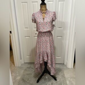 Chic floral dress with a high low hem. Features flutter sleeves and a flattering silhouette. Ideal for stylish outings.