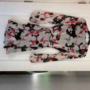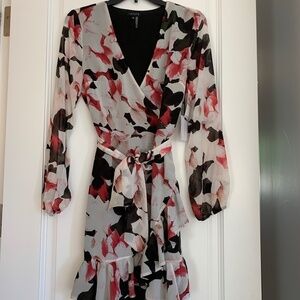 This beautiful and flowy 1.STATE wrap dress features v-neckline, long semi-sheer sleeves, tiered ruffled hem, and snap front closure.