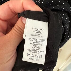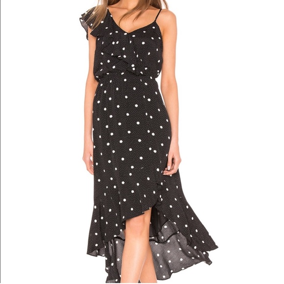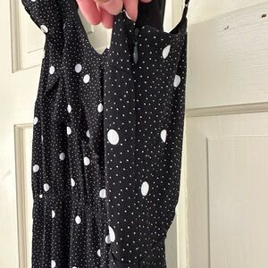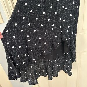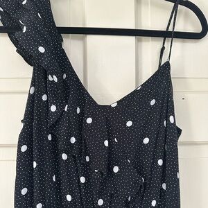 Super cute asymmetrical black dress with large and small white polka dots. Adjustable spaghetti straps with high low hemline. Dress is fully lined and zips up the side.