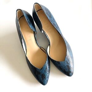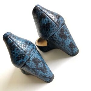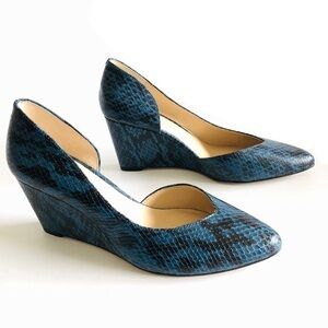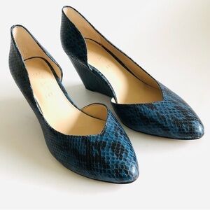1. State Melman snake print wedge in new condition. Leather blue/black snake print called ‘Royale’, pointed toe, half d’orsay, cushioned footbed. See pictures for heel height.