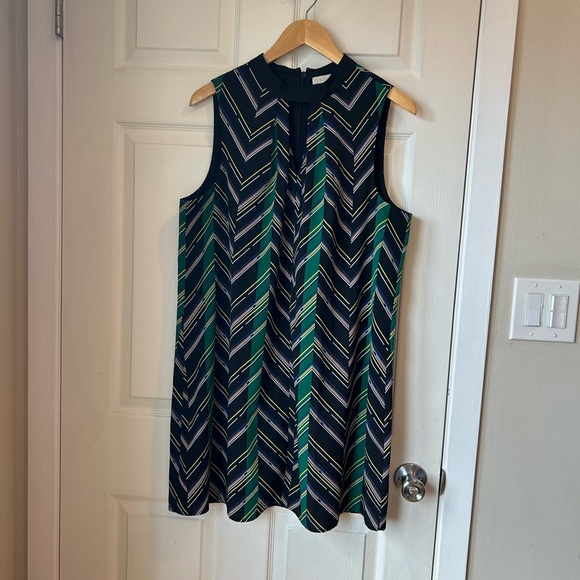 Chic dress with chevron pattern, Features black, green, and white accents. Front has a small opening to the dress design, Perfect for any occasion. Zip back, lined, over the knee length, flowy style perfect for summer evenings