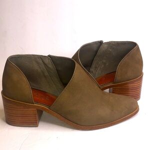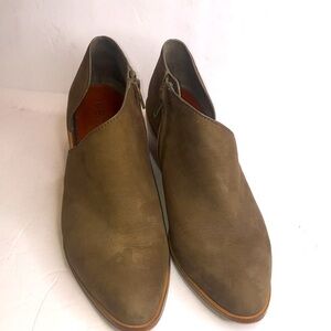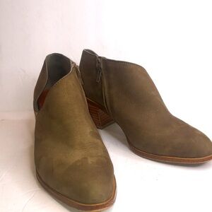 1. State Olive Green Isak Suede Leather Cut Out Bootie Size 8.5 EUC Inner zipper Leather sole Heel approx 2.25” Upper in excellent condition Some wear to sole