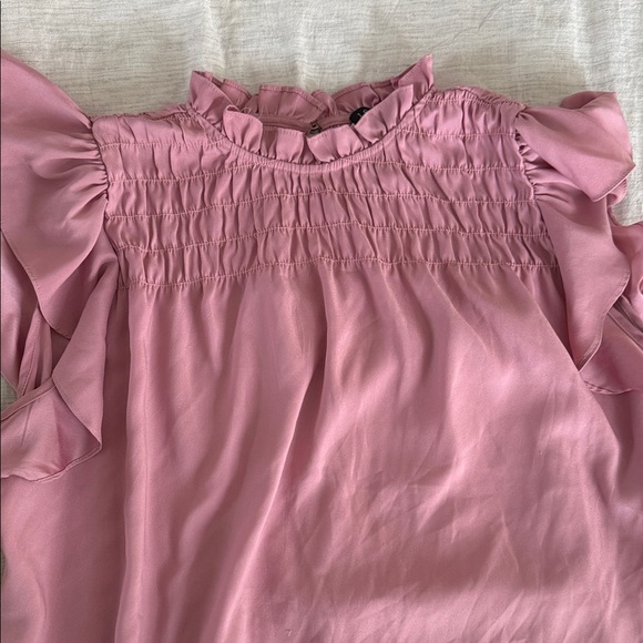 Elegant pink blouse with ruffle details. Features smocked neckline and sleeves.