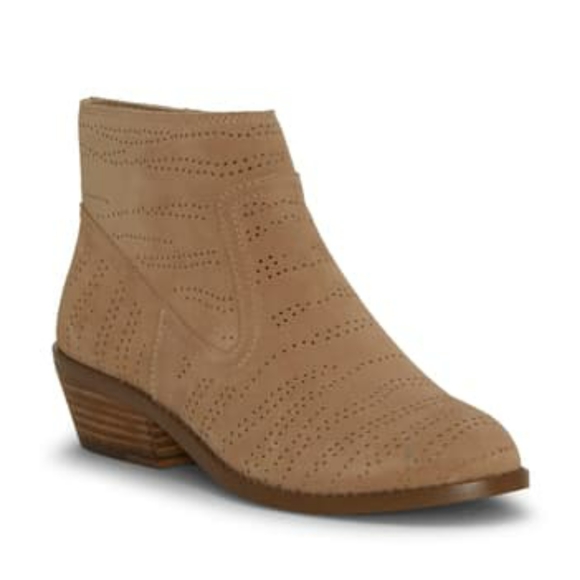 A perforated design brings breezy style to a versatile bootie set on a low, stacked heel. Sizing: True to size. - Round toe - Covered vamp - Perforated leather upper - Side zip closure - Lightly cushioned footbed - Stacked block heel - Approx. 3" heel - ImportedMaterialsLeather upper, synthetic lining and sole