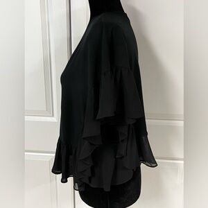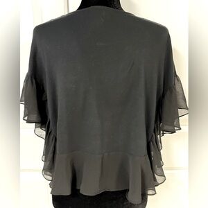Color: Pitch Black Ruffle trim V-neck Stretchy fabric 22 in. Pit to pit 20 in. Long Good condition #233