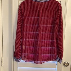 1. State red button down blouse. Size S. Good condition. 100% polyester. Machine wash. Approximately 24 1/2” from shoulder to hem.