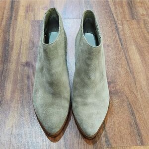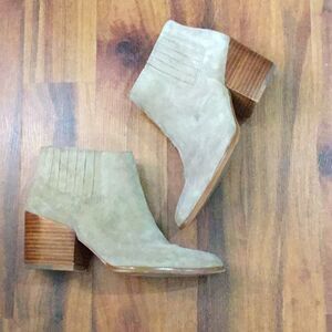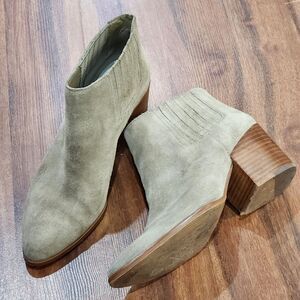 1. State Taupe Suede Bootie Heels. These booties are in good condition. The are a few scuffs on the heels as shown in the picture above. The heel is 3” tall. Awesome to wear for a walk out on the town!