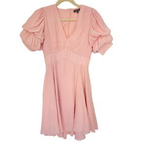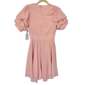 100% polyester Hand wash Fully lined Hidden back zipper closure Ruffle puff sleeves Does have side pockets Lightweight matte satin fabric Size XS New with tag Bin 0070034