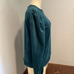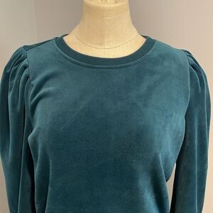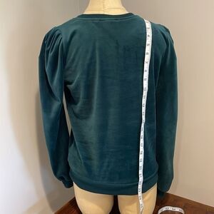 Excellent condition, 1. State Velour Long Sleeve Top Size S. Color green, puff sleeve velour sweat top. 95% polyester and 5% spandex – machine wash cold. See pictures for length and armpit to armpit measurements.