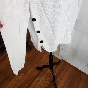 Looks like new, pure white comfy pull over waffle weave top 1” longer in the back than the front. Both sides have three buttons that could open to a 14” slit. In excellent condition, fun by itself or over the top of something else!