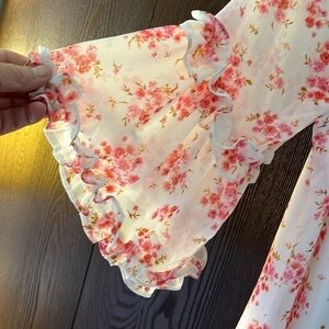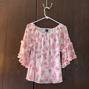 1.State boho sleeved white with pink floral sheer top. Fully lined. Double ruffles on the 3/4 sleeves. Size XS. Can be worn on the shoulders.